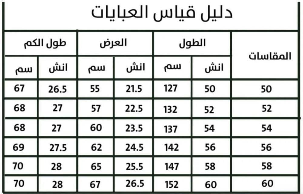 * نحيطكم علمًا بأن العرض للعباية دبل الموجود في جدول القياسات
